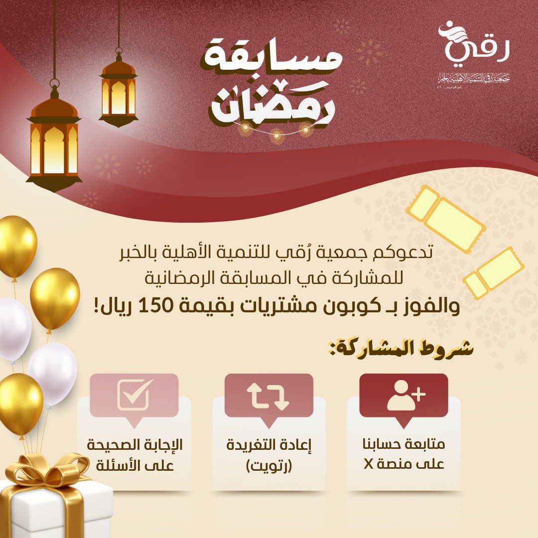 نفذت الجمعية مسابقة رقي الرمضانية خلال شهر رمضان المبارك، حيث تنوعت أسئلة المسابقة بين ثقافية ودينية ووطنية، فيما بلغ عدد المشاركات أكثر من 12 ألف مشاركة، واختتمت المسابقة بتوزيع الجوائز على الفائزين.